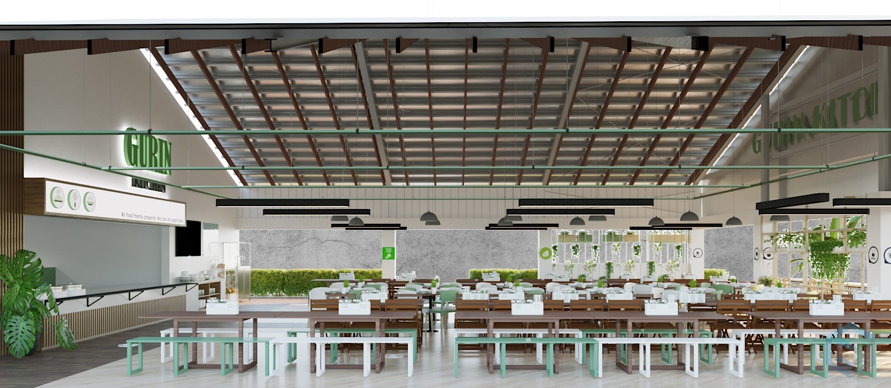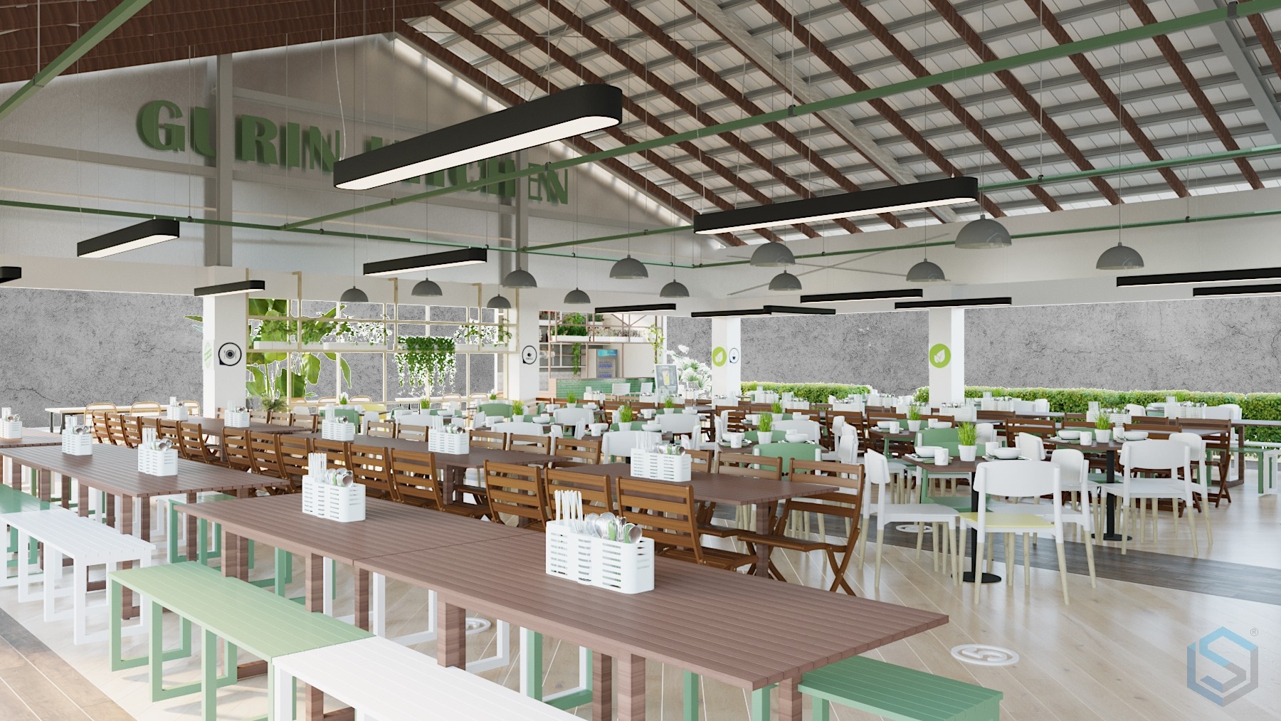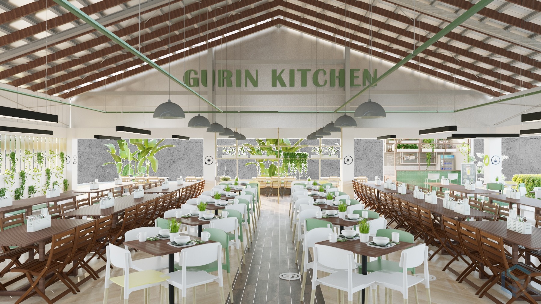 Như chính cái tên Gurin Kitchen, căn tin của Takako lấy cảm hứng thiết kế từ màu xanh lá tươi mát - cũng là màu thương hiệu của công ty. Màu xanh lá đến từ những mảng tường sơn nhấn tinh tế, từ nội thất, line đèn...và đặc biệt là từ cây xanh.